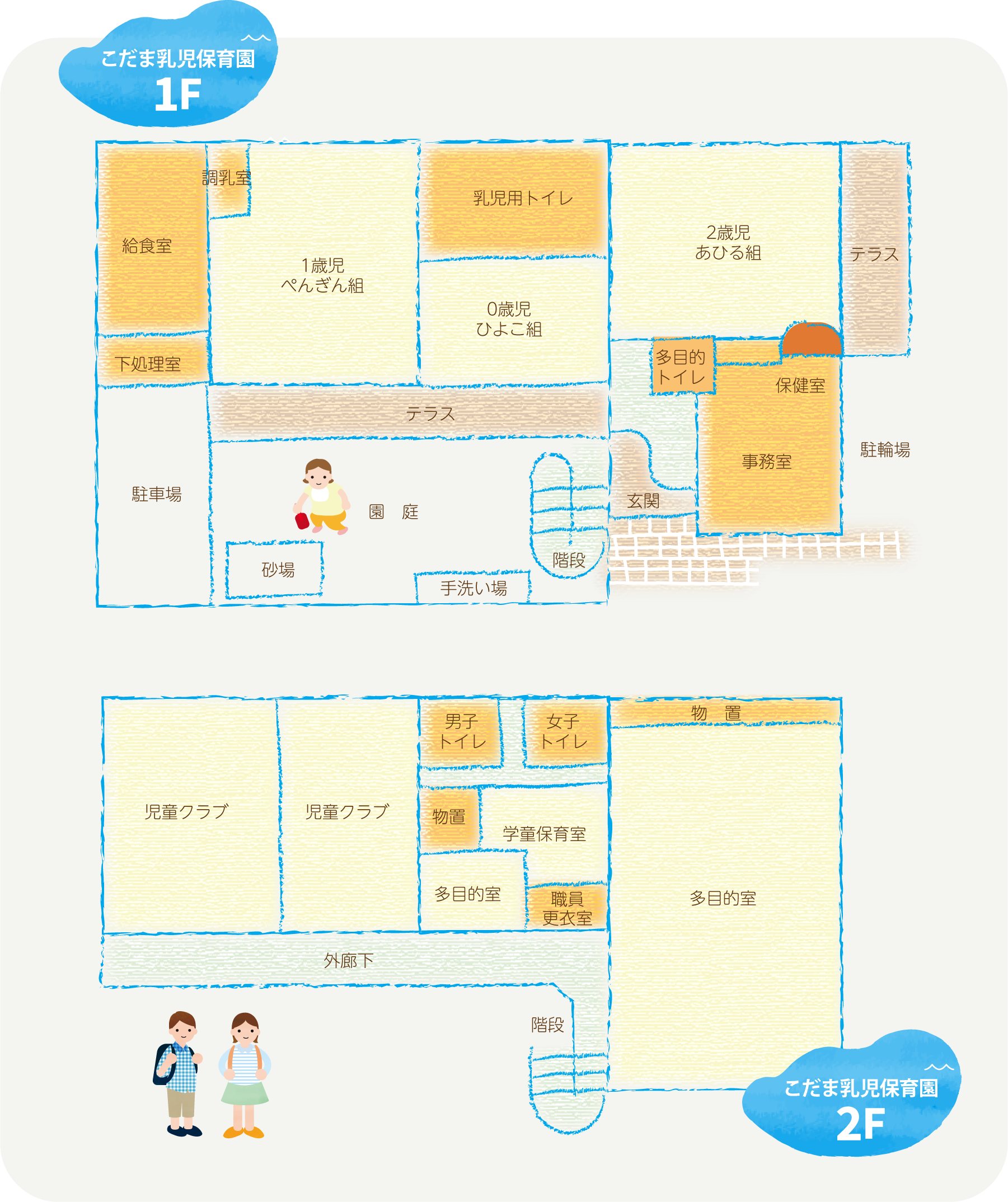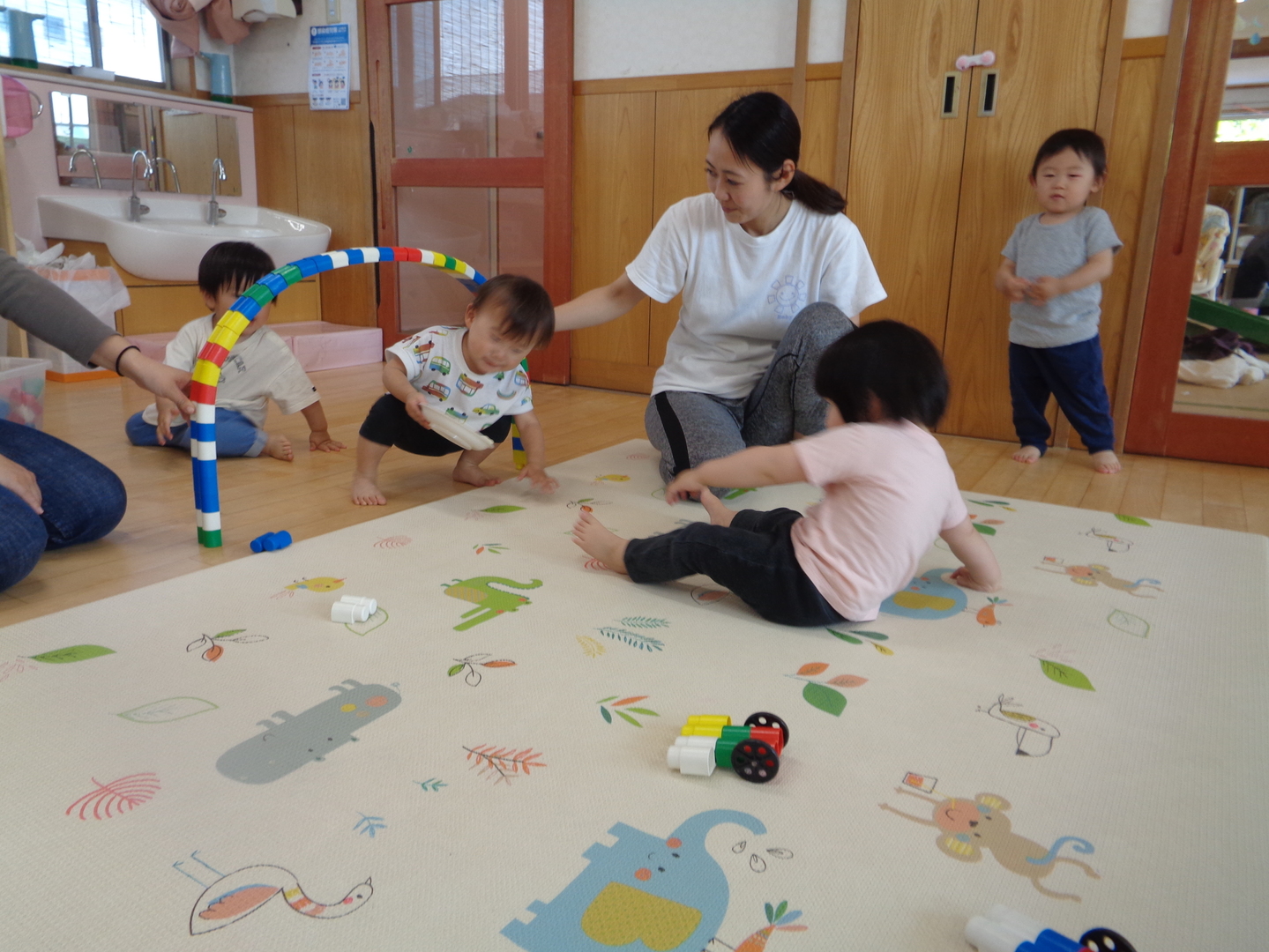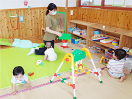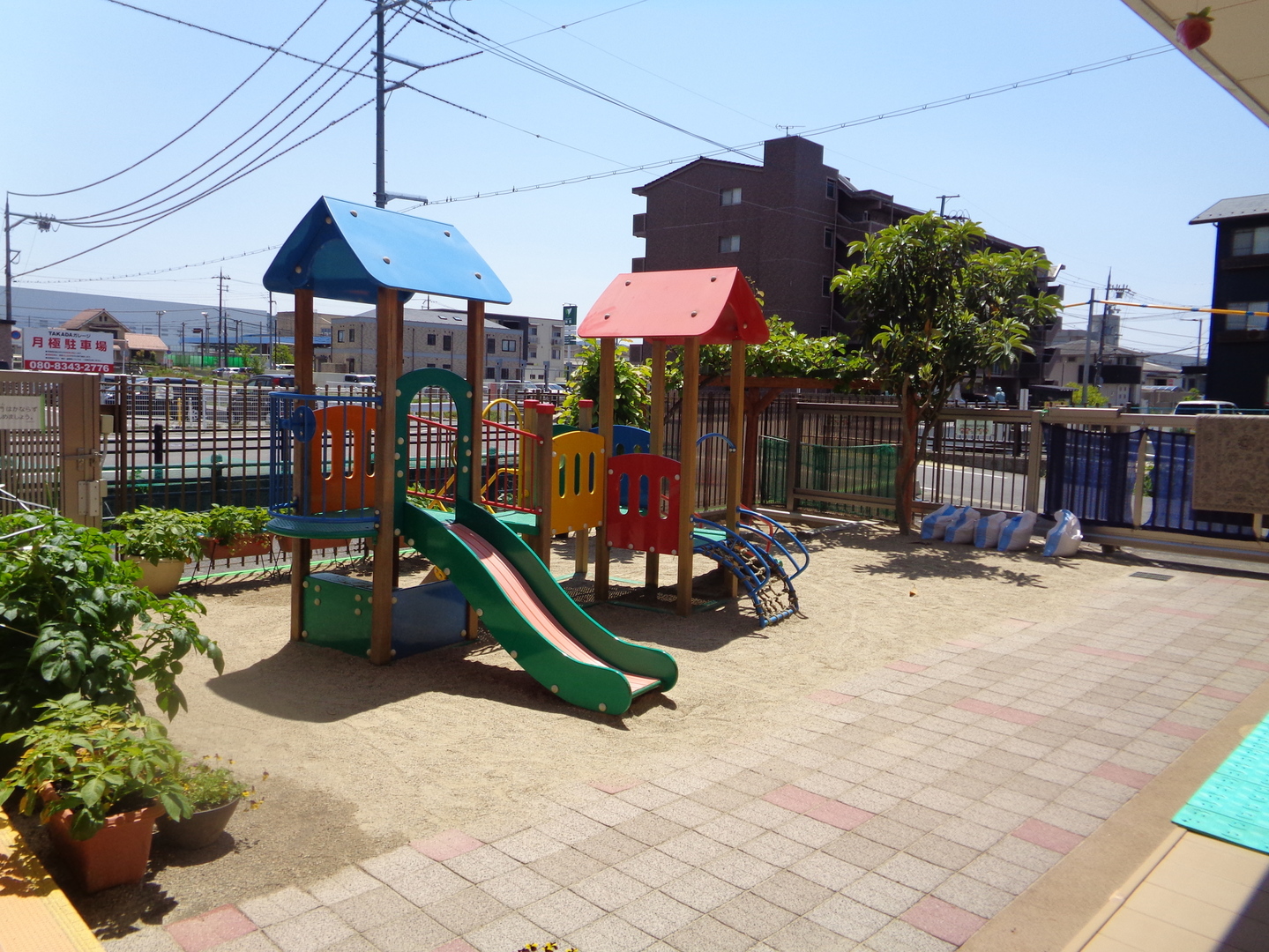 保育室からすぐに出られる園庭があり、ボールや車で遊んだり、砂場で大きな山を作ったりして遊んでいます。園庭の隅で野菜などを栽培し、成長を楽しんでいます。