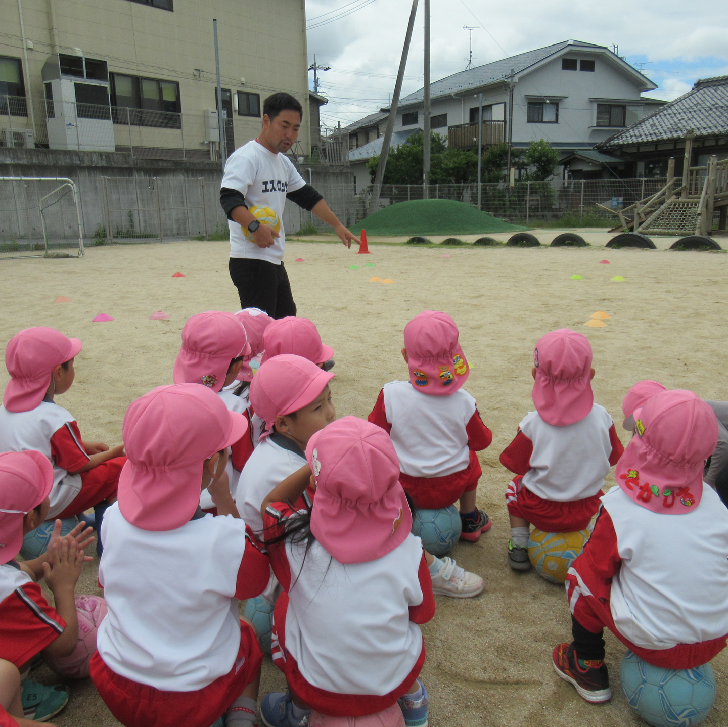 月に1回コーチに来ていただき、初めはボールに慣れ親しむところから始まります。ボールを通じて元気に体を動かす楽しさや、友だちと協力して遊ぶ楽しさを感じています。